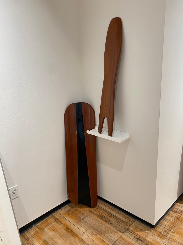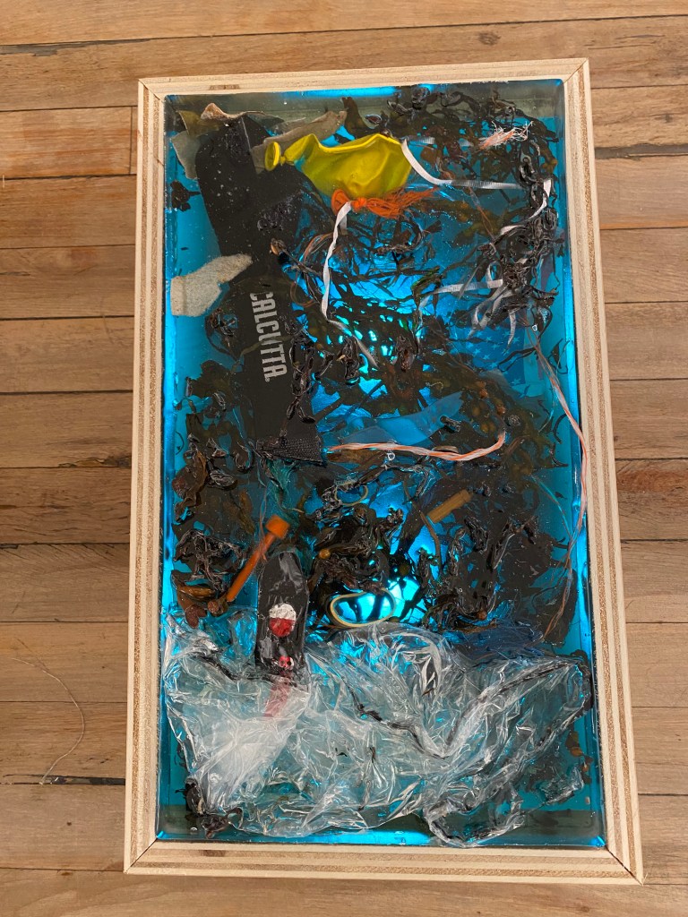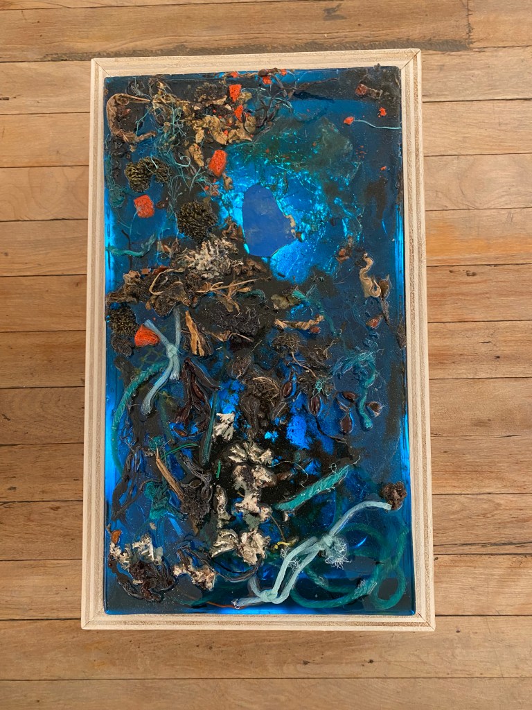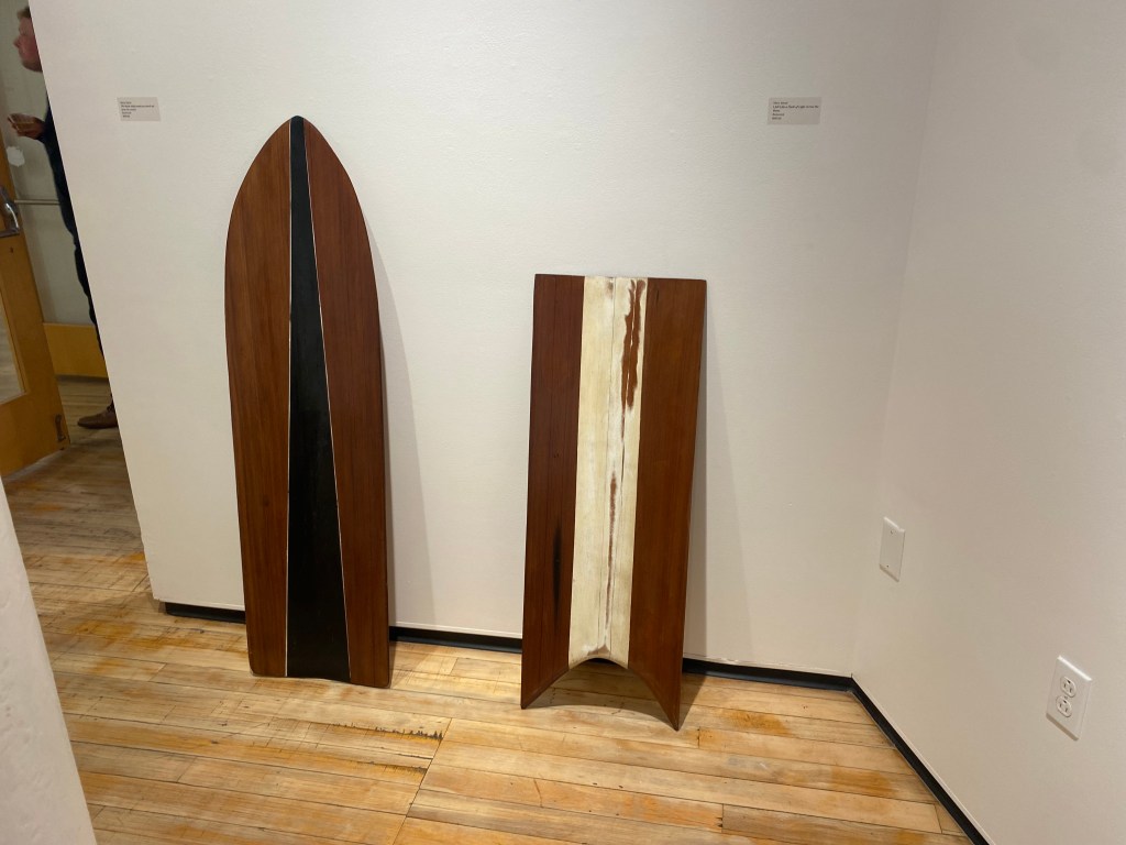 I began collecting discarded fishing lines and netting seven or eight years ago attracted to the beautiful array of colors I associate with the Caribbean. Over time, other objects caught my eye entangled in seaweed or the eroded tree roots that line the coasts. Often the objects are familiar, at other times they only exist as fragments but impossible to consider them as not part of a much larger whole – the dumping ground that our vast oceans have become, or always been. The epoxy ocean fragments represent vignettes, small little chapters, in what I still believe is a resilient ocean but one worth a more respectful relationship. The redwood wave riders emerged from a desire to create a so-called Paipo board, or body board for myself, inspired by a friend who had been building and riding waves on them on the coast. The paipo, originally constructed over three hundred years ago by Polynesians who considered wave sliding or riding, a cultural ritual. Having constructed one, a series soon followed, not further inspired by Polynesian rituals but by an esthetic pull to transform fifty year old redwood boards into wave riding shapes each suggestive of a rich and intriguing history of use. The taller riders stand like sentries, guards of the ocean.